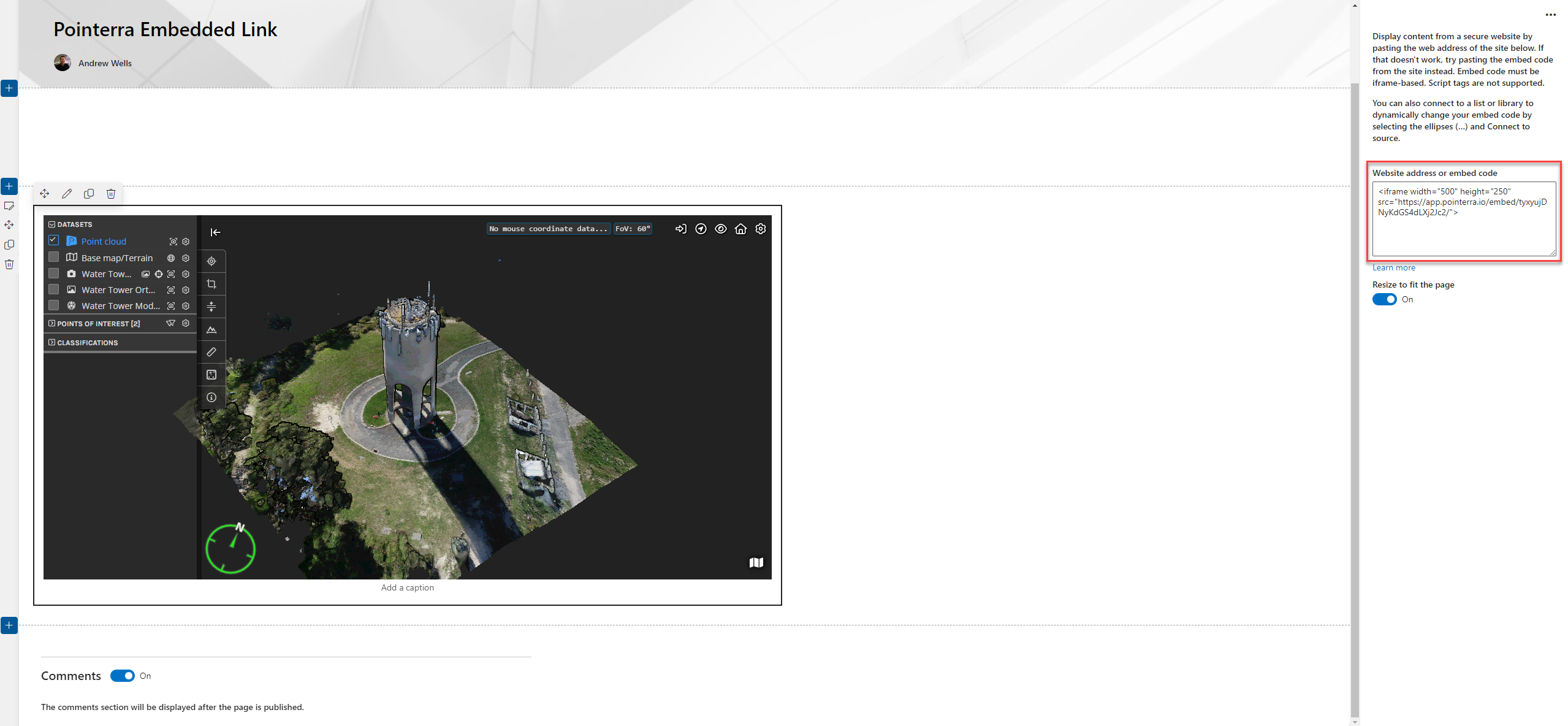 Paste your iframe into the "Website address or embed code" box on the right hand side. If SharePoint has allowed embed links from Pointerra then a preview window will appear.