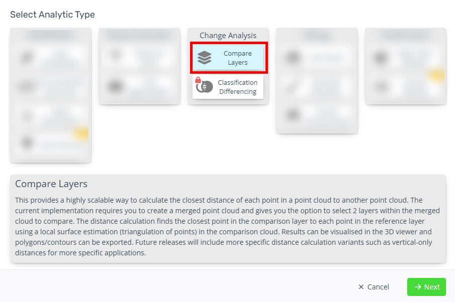 Identifying 3 dimensional change between 2 point clouds collected at different time periods due to man-made or natural causes is available via the Compare Layers analytic (for analytics subscription customers).