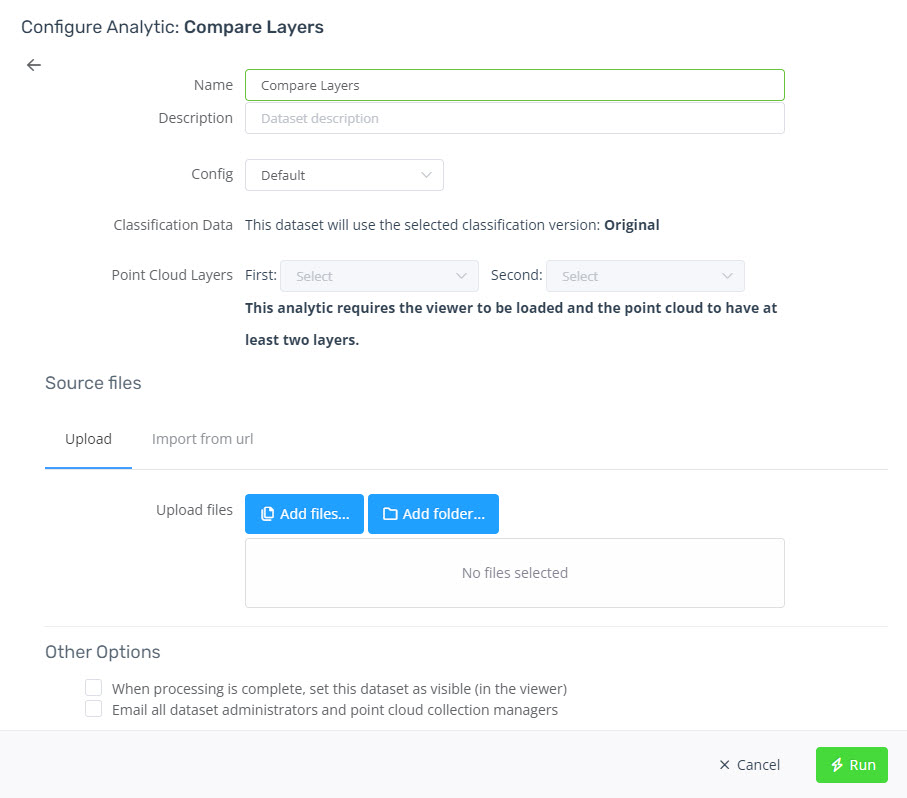 - Select Config: in most cases for our customers this will only be the Default option which is to search a maximum 3D radius of 10m and present change in 1m intervals (this is configurable in consultation with the Pointerra team).