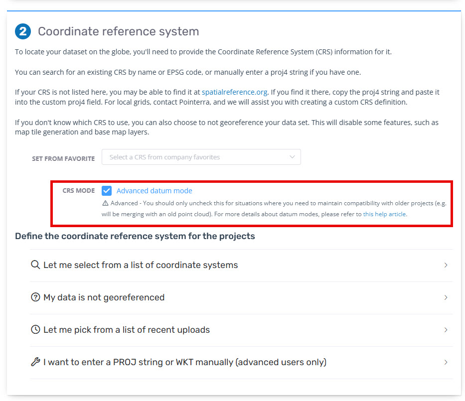 For most existing customers, there may be no need to move to the new advanced datum mode if your projects typically have all data referenced to the same datum. The overhead of needing to reprocess existing data would not be worth the benefit. For further assistance or more detailed information on transitioning to the new datum mode, please contact our support team.