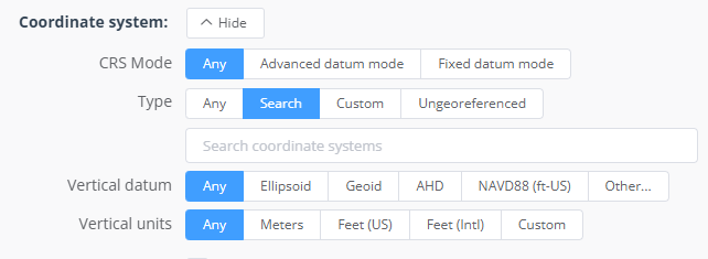 - Coordinate system - find projects that have a particular coordinate system. See below for more details.