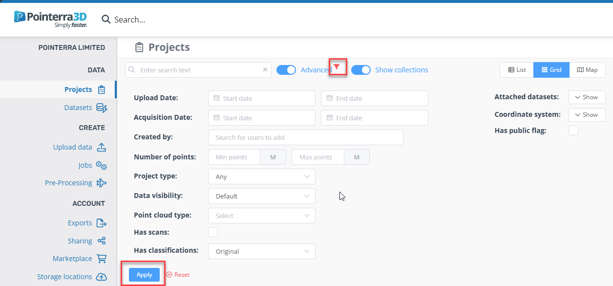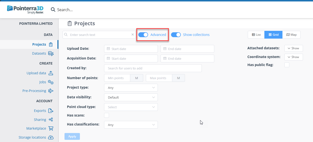 The "Advanced" project filters allow you to find projects with specific properties such as those within an acquisition date range, those with a particular spatial reference system, or those that have particular attached dataset. You can access these filters by enabling the "Advanced" switch on your company's project page:
