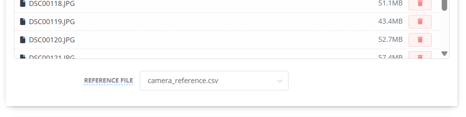 If your photos do not have position information in their EXIF/XMP metadata, you can also upload a reference CSV file containing the positions and optional rotation information. Once a CSV is uploaded you must select it from the "Reference file" drop down as seen below.