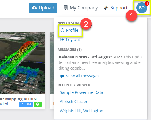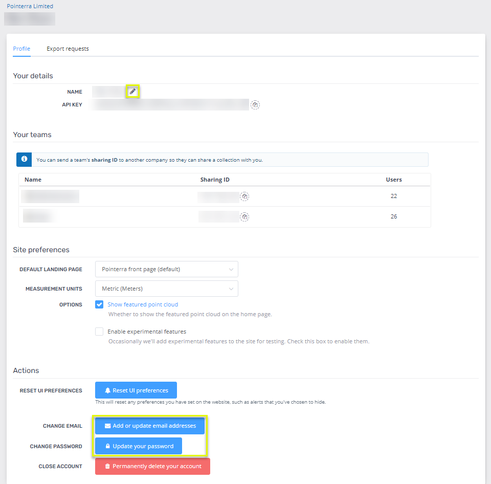 You can update your details - including name, email address, password, and preferences, from the User Profile page. Access the User Profile page from the account menu (the menu at the top right of the page, with your current user name)