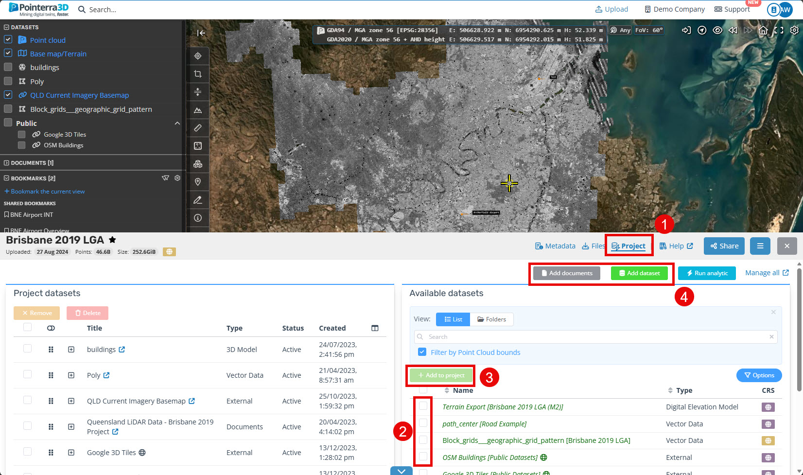 If the Dataset you wish to add has already been upload, select it from the "Available datasets" list (2) and click "Add to project" (3).