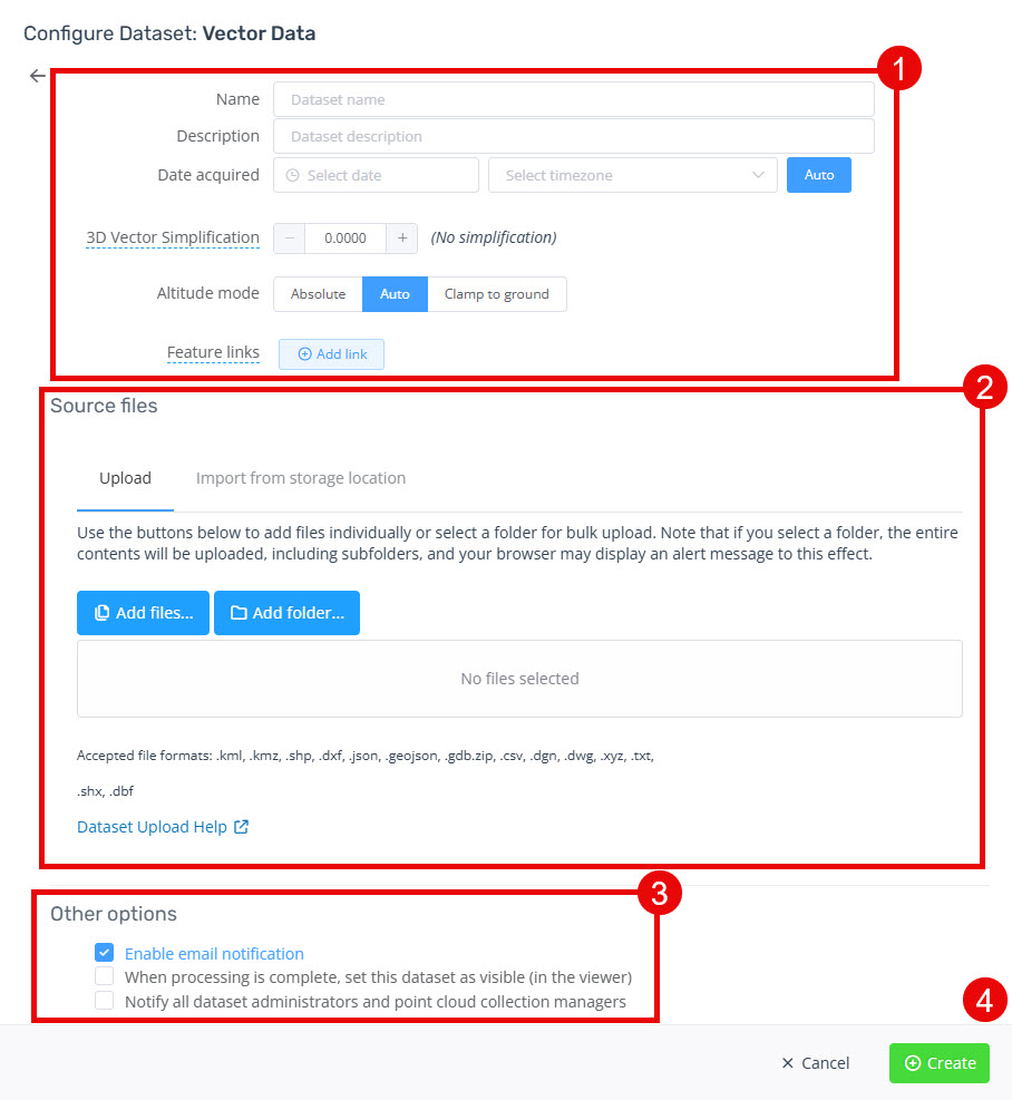 Click "Create" to start the upload and import of the dataset (4).