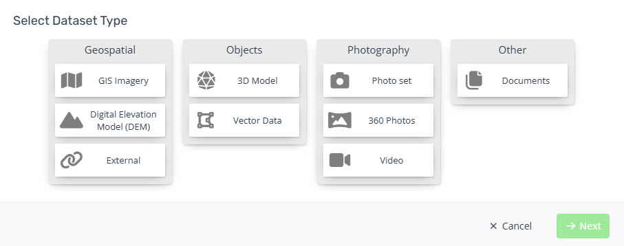 Select the Dataset Type (e.g. Vector Data) from the GUI and choose "Next".