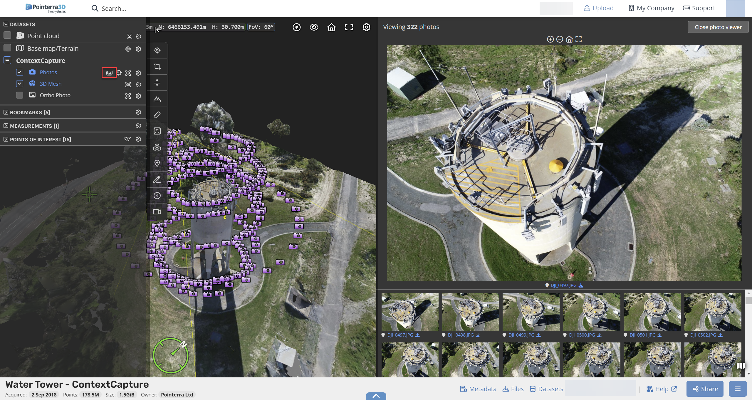 Firstly, on the left side tab, select the box for the photogrammetry dataset (this is indicated by a photo icon next to the name), if have selected the right dataset, the viewer will load purple camera icons scattered throughout the point cloud viewer.