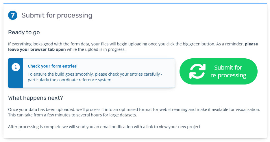 If you have already uploaded a point cloud, and you need to modify the processing parameters (e.g. your processing failed, or you realised that you incorrectly entered the spatial reference information), or you want to add/remove additional point cloud files and build a new version, then you can use the Jobs tab in your company page to edit an existing job and reprocess it. In doing this, you will not need to re-upload any files that are already uploaded from the previous job.