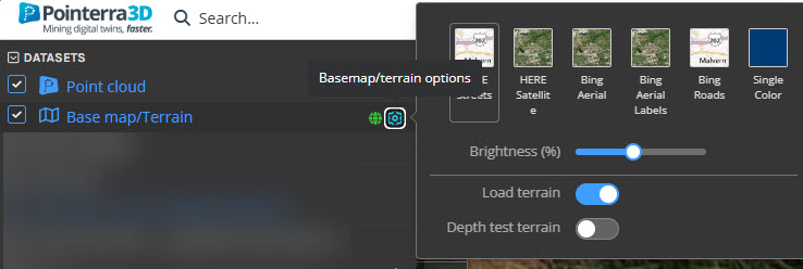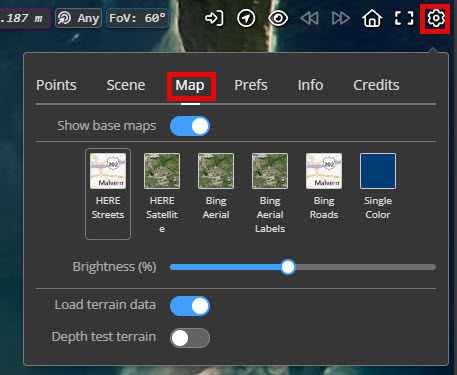 Base maps can be enabled or disabled either via the list of datasets on the left hand side or the Global settings menu ("Cog" icon in upper right of the 3D View) under the Map tab (this will only be available for georeferenced point clouds). From here you can show or hide base maps (shortcut key: B), adjust the base map brightness and select the map layer you would like. Alternatively, you can enable and disable the base map layer using the checkbox next to Base map/terrain under the Datasets tab in the Left panel.