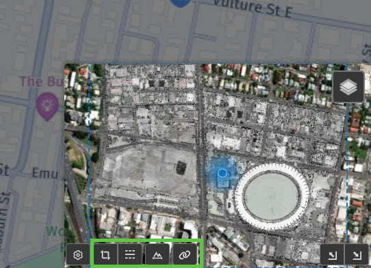 The "Cog" icon in the lower left of the overview map can be used to control which things are visible on the map such as whether to display the latitude and longitude of the map centre. Hovering over the "Stack" icon in the upper right of the overview map will reveal a menu where you can select which base map layer to display as well as control the visibility of other data layers such as Points of Interest and source files extents. You can also change which point cloud display mode (e.g. colour point by height) will be rendered as an overlay.