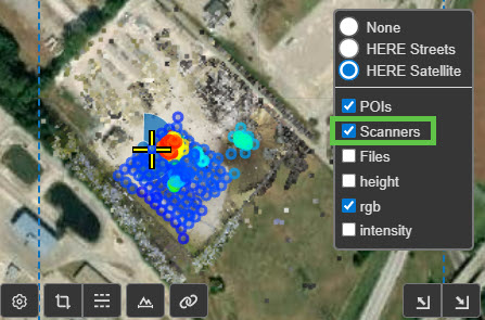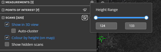 The scan markers can be turned on and off in the 3D View via the Visibility menu in the upper right of the 3D View or under the Scans tab in the Left panel (shortcut key: C). Scanners can be filtered by height using the Min and Max height fields under the Scans tab.