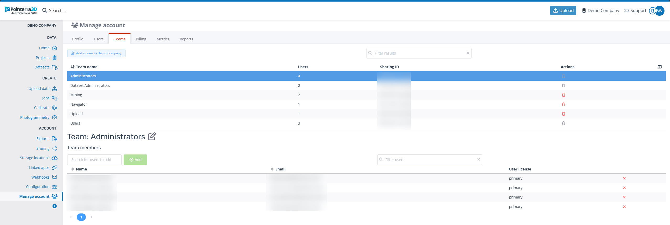Under the teams tab, you can find current teams and create them as well as allocate users with certain permissions and access to those different teams. From the teams tab, you can see the name, number of users and sharing ID of the teams. By clicking on each team you can see all the individual users (names and email) that have been appointed to that team.