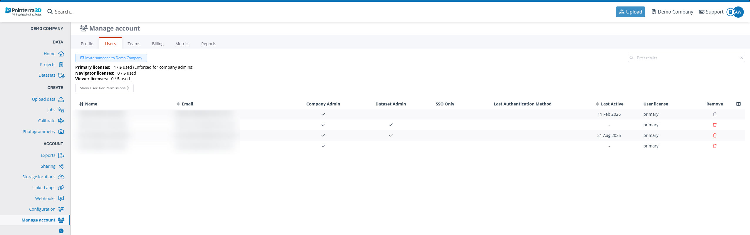 Under the users tab, you will find a list of all users currently in your company as well as the permissions that they have. Click on a user to see more detailed information about their recent site activity or any recent actions. To add users to your company, use the Invite someone button. See Adding users to your company and User Information and Tier Permissions for more information.