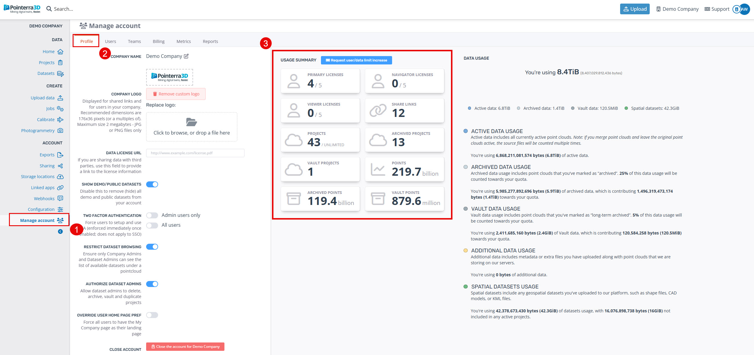 To manage your company, head to the Manage company tab on your company page (1). The first tab is your company's profile (2), here you can edit information about your company such as its name as well as add your company's logo to display (As shown in the top left corner). You are also provided with several preferences to determine how your users interact with the account, such as two factor authentication or restricting the viewing of datasets. On the right side of the page is the usage summary for your company (3), displaying general account information such as how many point clouds or users you have as well as requesting an increase in users/storage.