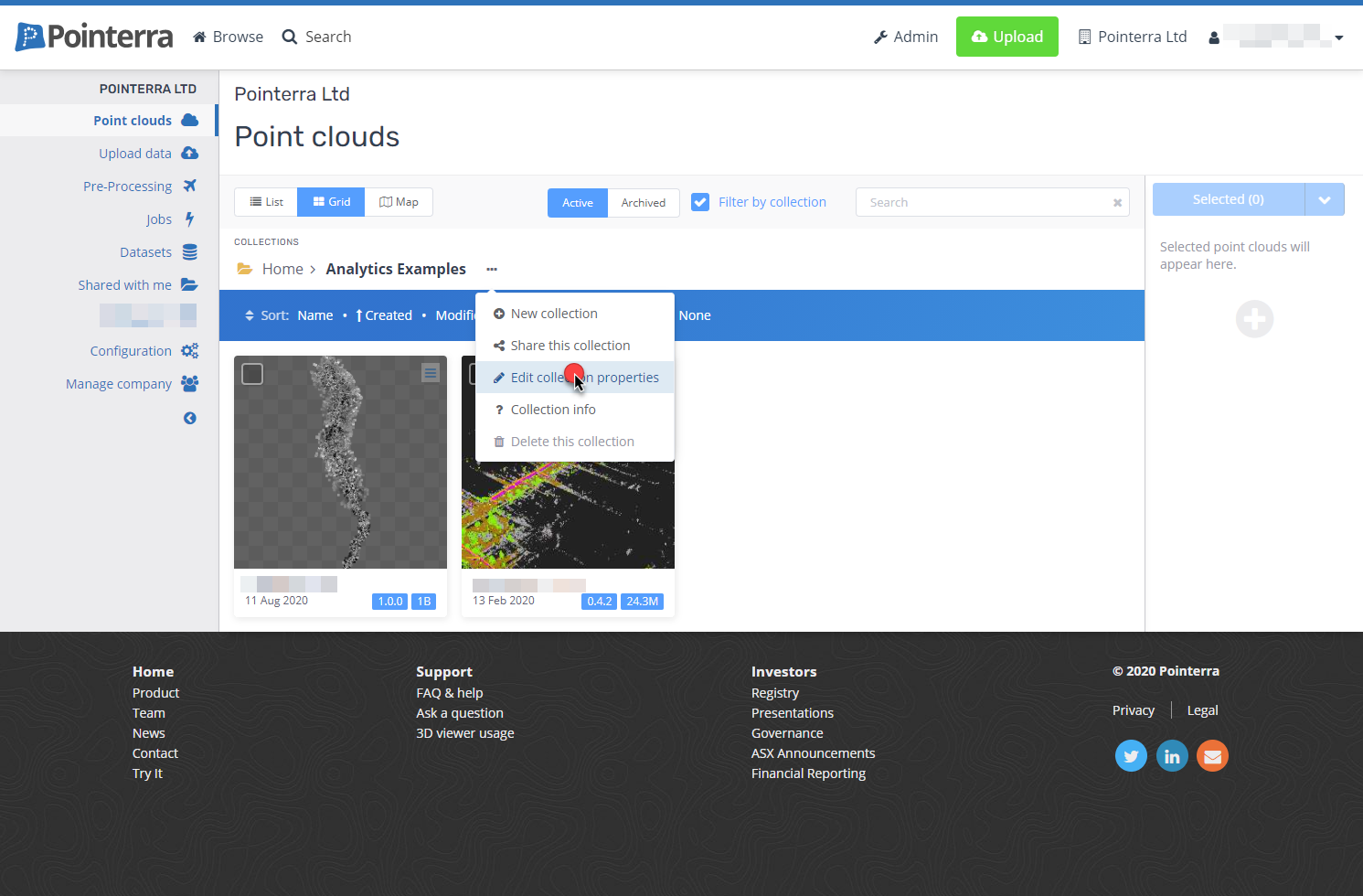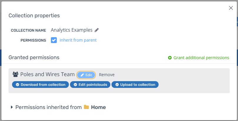 - Give the team "Edit pointclouds", "Download from collection" and "Upload to collection" permissions for the collection. For more details see here