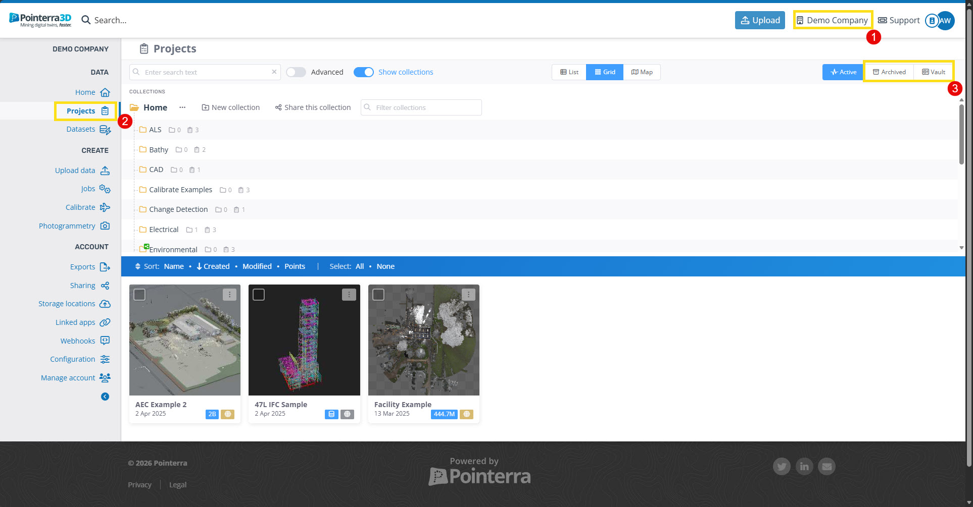 To access the archive or vault for the company's point clouds, select the company name in the top right (1), then the Projects tab (2) followed by the Archived/Vault tabs on the right (3).