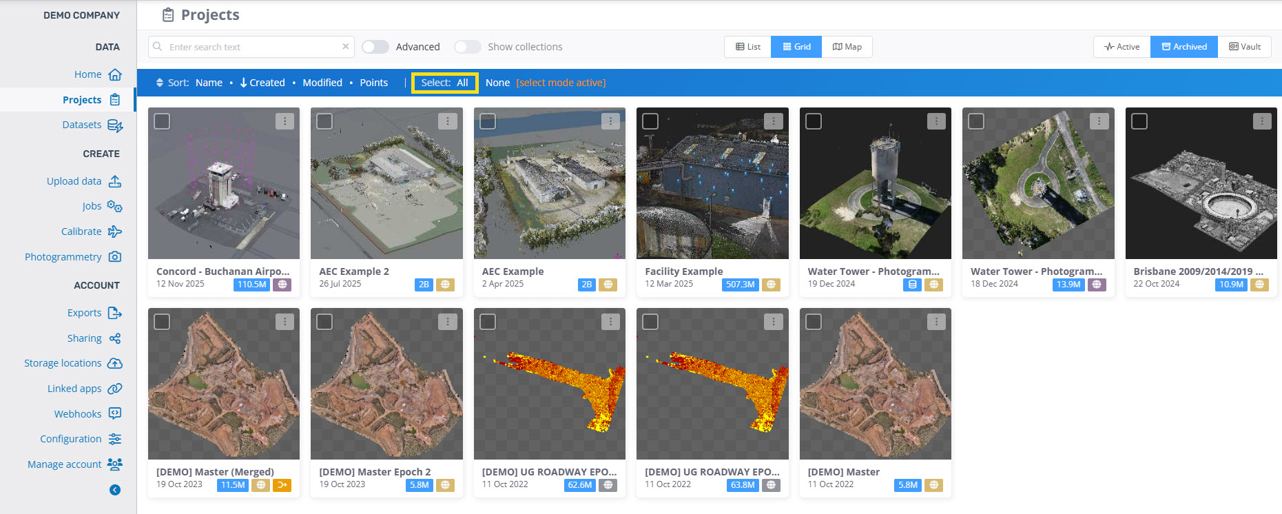 When managing point clouds from the company page, to select multiple archived/vaulted point clouds, just click on the thumbnails of the point clouds. To manage all point clouds in the current folder/collection select the "All" filter button highlighted above the shown point clouds.