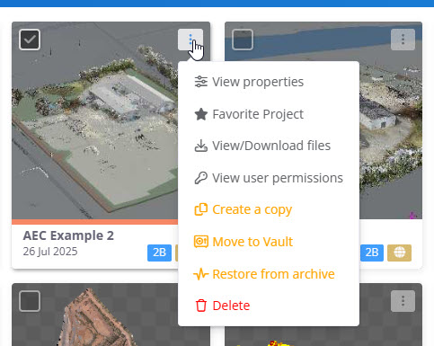 To view the management options for vaulted point clouds, first select the vault filter (highlighted) and then select the box in the top right of the thumbnail (highlighted) of the desired point cloud: