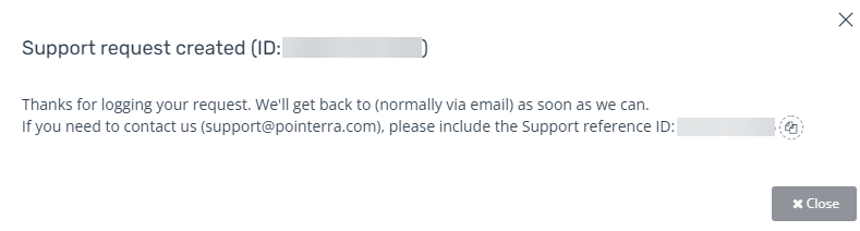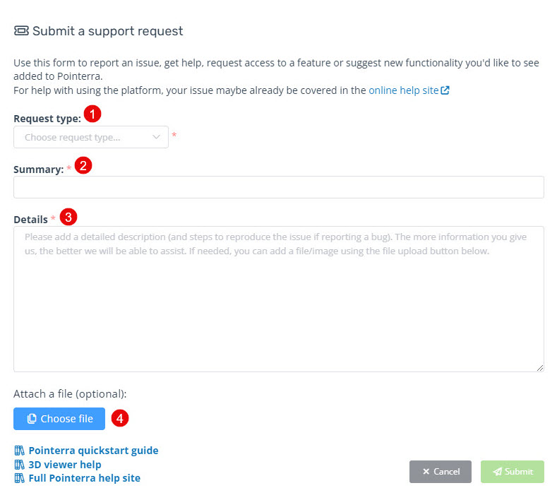 If you encounter a bug, need assistance, or have suggestions for improvement, you can easily submit a support request through Pointerra.