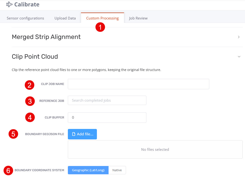 To select the input parameters for Clip Point Cloud job load the Calibrate Processing>Custom Processing tab (1):